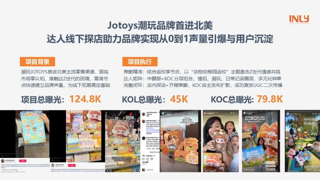 潮玩品牌JOTOYS首进北美潮玩零售渠道时,面临品牌认知困境。 我们抓住返校季节点,打造动物幼稚园返校主题,通过KOL+KOC矩阵发起探店活动,实现曝光124.8K,并激发用户UGC创作,为品牌后续海外实体扩张积累品牌声量与种子用户基础。